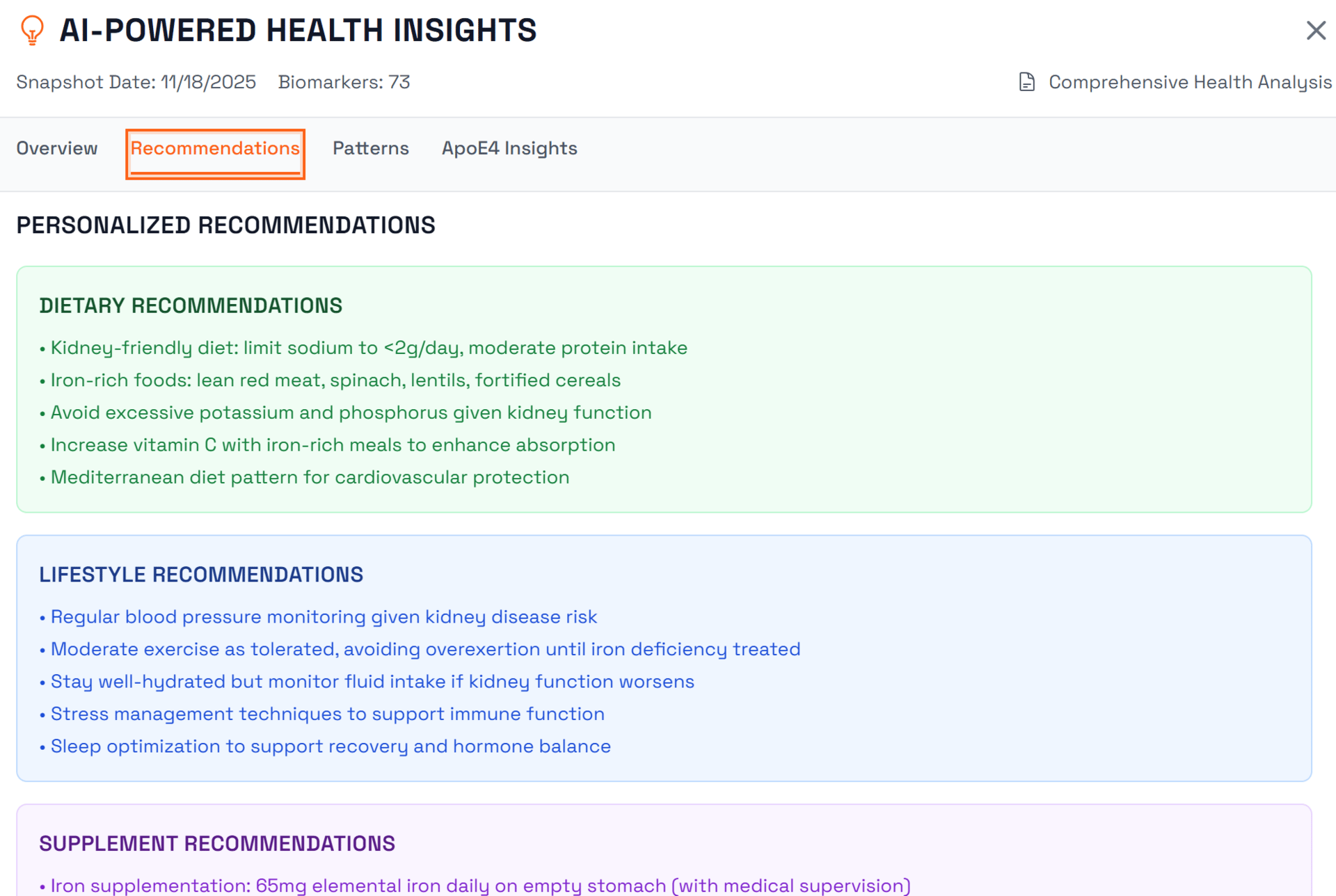 Your predicted stack: Based on your genetics (APOE4 3/4, MTHFR +/+), baseline markers (TG 145, HDL 48), and lifestyle factors (moderate exercise history), you're likely a high responder to omega-3s and cardiovascular exercise.